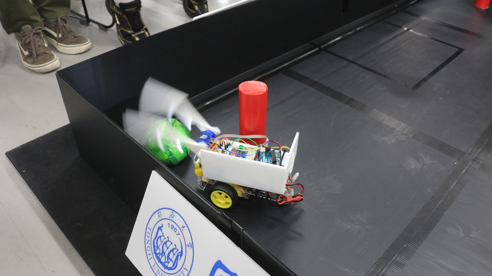 最終日には各チームがロボットカーのデザインやプログラムなど7日間の活動の成果を英語で発表し、その後は作製したロボットのコンペティションを行いました。フィールドに置かれた5つのスイカ(紙風船)を同時に2チームのロボットが叩き合い、5分間でより多くのスイカを割ったチームの勝利です。前日まで試行錯誤を繰り返したロボットがスイカを叩くことに成功するたびに歓声があがり、2チームのロボットが同時に1つのスイカを狙うシーンでは大きなスポーツの試合を見るような盛り上がりをみせました。