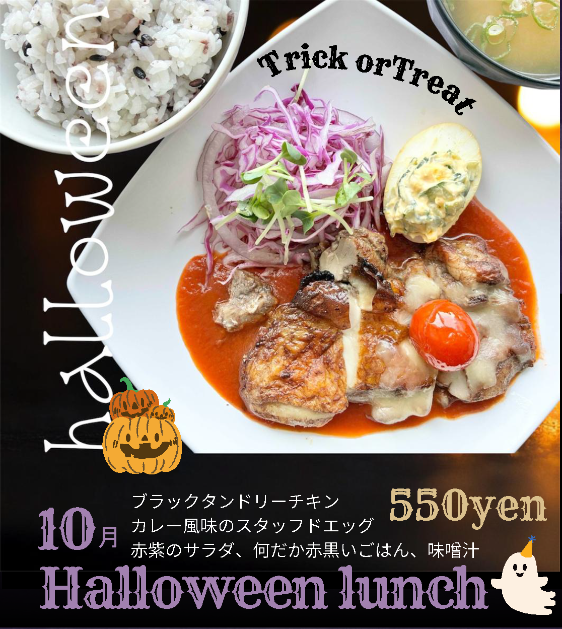 サラダとごはんは紫色にして、ハロウィンの色味を演出しているところがポイントです!