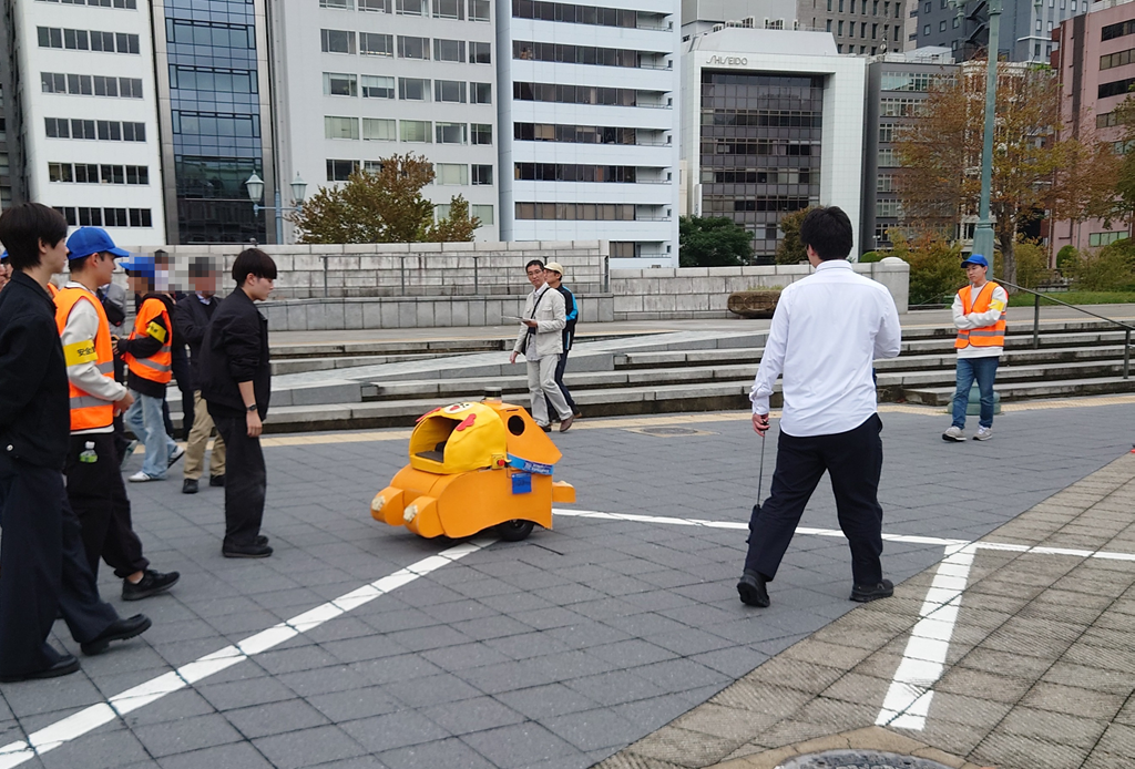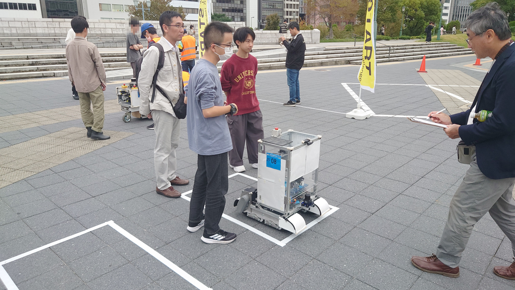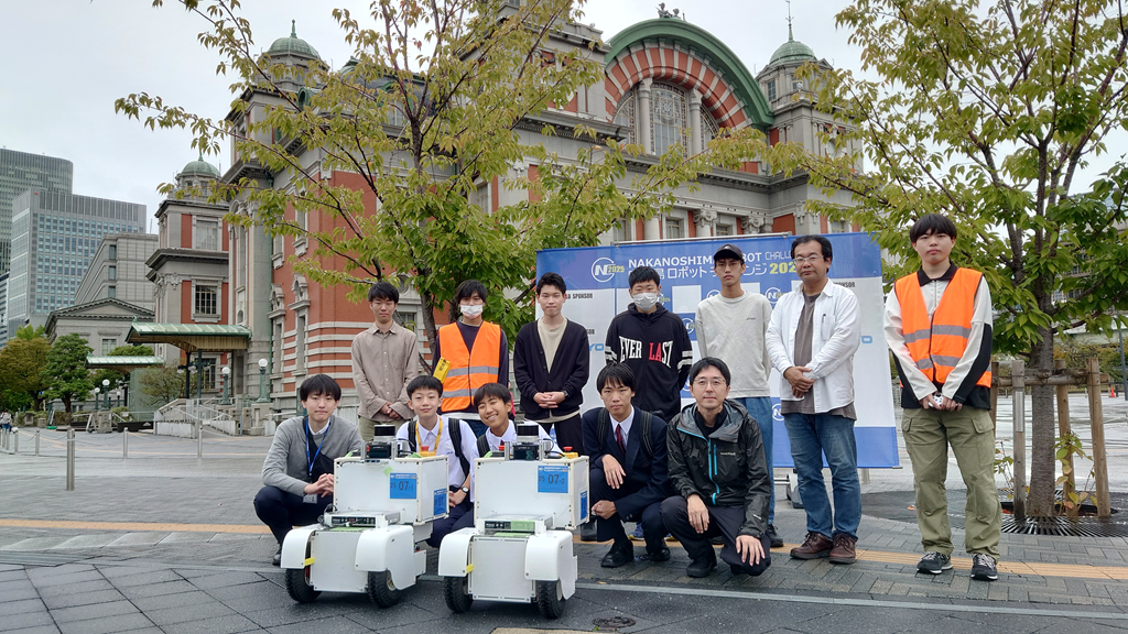 9月27・28日、10月25・26日に大阪府中之島で開催された「中之島ロボットチャレンジ2025」に本学の情報科学部、ロボティクス&デザイン工学部で開発したロボットが出場しました。「中之島ロボットチャレンジ」は人々が往来する屋外で自律移動ロボットが問題無く行動できるかどうかを検証する大会で、中之島中央公会堂および中之島図書館を周回する約500mのコースを、道行く人々を回避し、段差のある路面を乗り越えてゴールを目指すという課題が与えられます。今年度はルールが追加され、横断歩道で正確な一時停止が義務付けられました。これは幅60cm程度の限られた空間にロボットが誤差なく停止することを求めるもので、参加チームが苦戦を強いられた大きな技術的難題となりました。