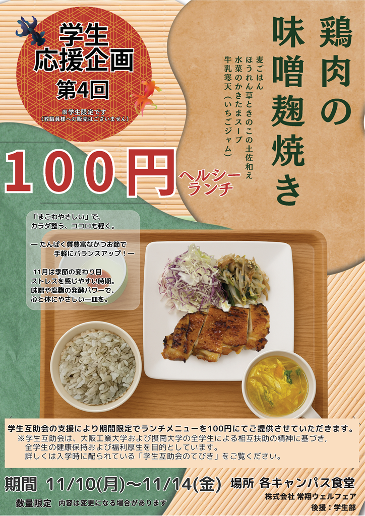 11月10日から14日まで3キャンパスの食堂で、学生限定で100円ランチを提供します。