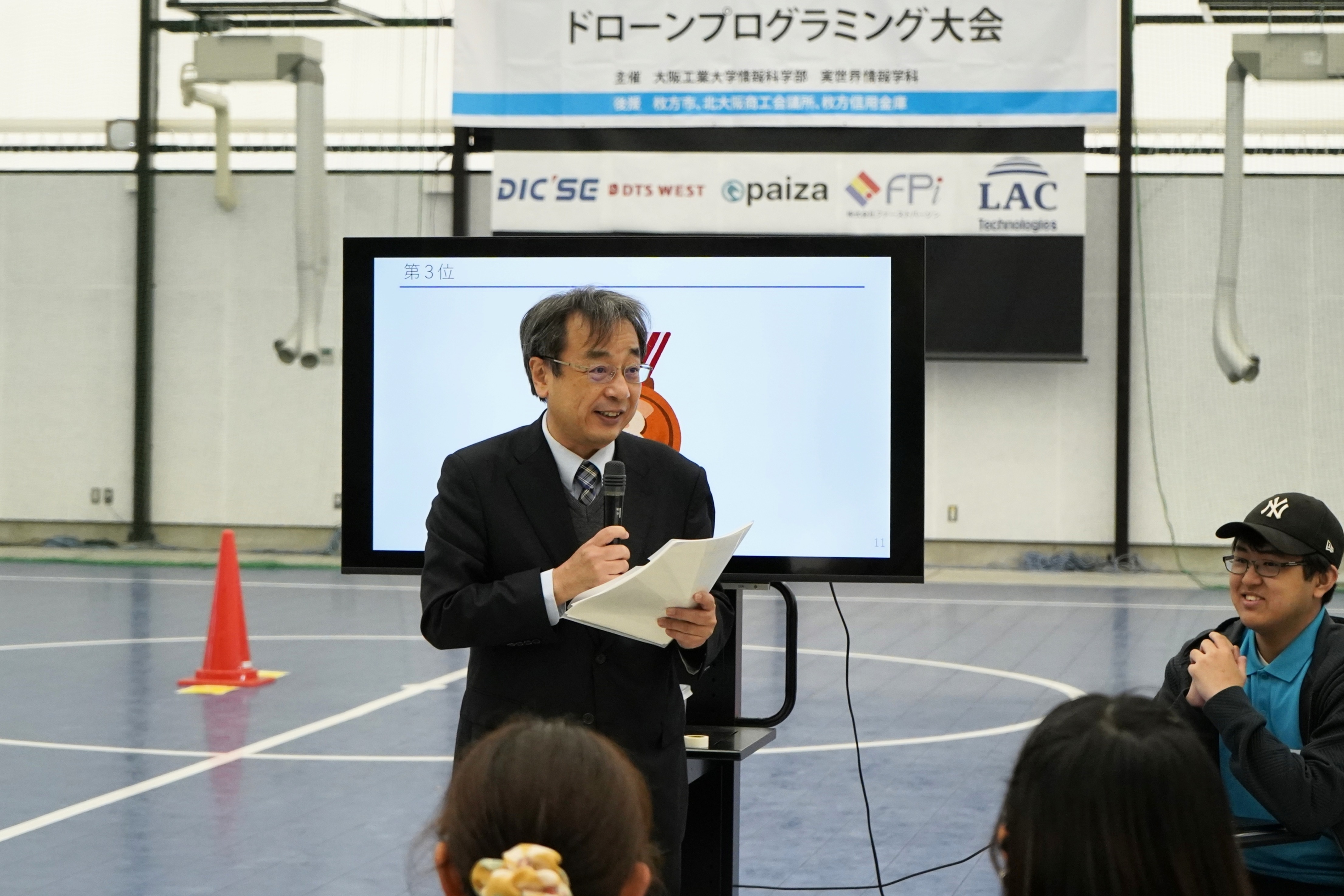 午後からは、主催者を代表して井上晋学長が挨拶を行い、続いて本大会を後援する枚方市、北大阪商工会議所、枚方信用金庫の来賓からも激励の言葉をいただき、競技会が開会しました。各チームは、順にドローンを飛行させ、3つのゴールへの到達状況とそのタイムによって得点を競いました。午前のテスト飛行では安定していた機体が、座標ずれを起こしたり、思わぬトラブルに見舞われるチームもあり、チームメンバーは飛行の様子を固唾をのんで見守りました。競技は、2回のフライト結果の合計得点で順位が決まり、表彰式では、椎原正次情報科学部長から賞状と副賞が授与されました。椎原情報科学部長は、「今回の大会で覚えておいてほしいことは2つあります。ドローンがプログラミングによって思いどおりに動く楽しさ、そして、日常の中で感じる不便や課題を解決してくれるのがテクノロジーだということです。専門的な知識が無くても、テクノロジーを上手に使いこなせることが大切です」と参加者に向けてエールを送りました。大会は終始にぎやかな雰囲気に包まれ、盛況のうちに幕を閉じました。
