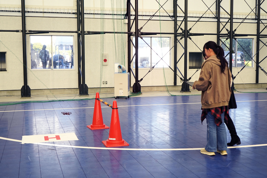 午前中は、ドローンプログラミングの基礎を学ぶ講習会を行い、参加者は、基本となるプログラミングをシステムに入力し、ドローンを動かす体験をしました。その後、競技フィールドに移動し、床に設置された25㎝四方のタイルを指標に、スタート位置からゴールまでの障害物の高さや距離を計測しながら、実際にドローンを飛ばしてプログラムを調整しました。