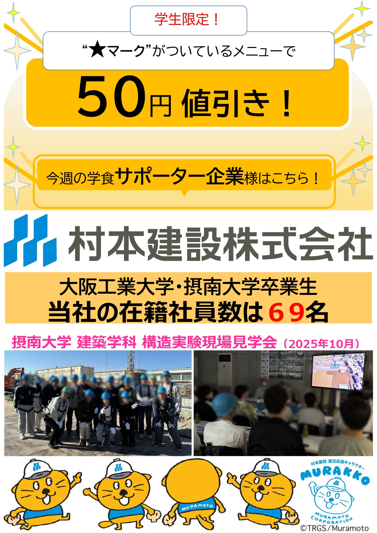 大阪工業大学の食堂で村本建設株式会社様から協賛頂き、学生限定でメニューの値引きを行う食支援を実施します。