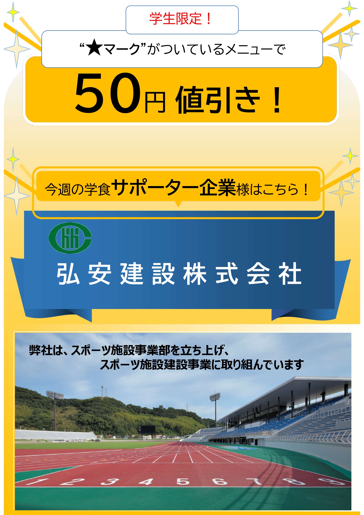 大阪工業大学の食堂で弘安建設株式会社様から協賛頂き、学生限定でメニューの値引きを行う食支援を実施します。