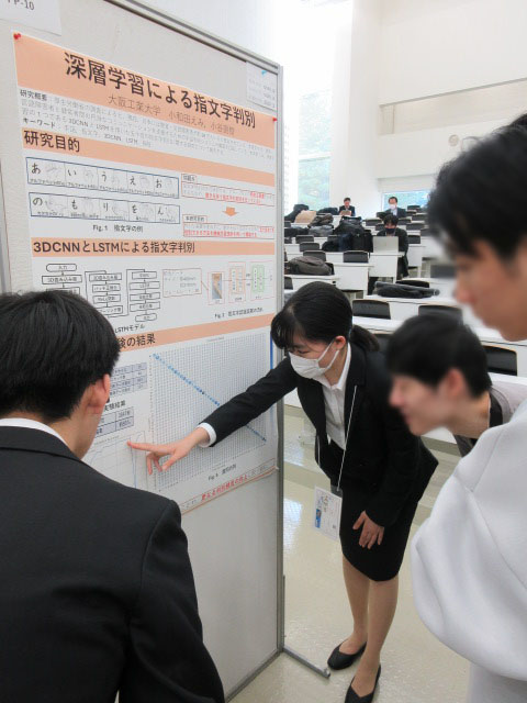 2025年11月12日(水)から14日(金)に、東北大学青葉山キャンパスで開催された計測自動制御学会 システム・情報部門 学術講演会(SSI2025)において、学習・先進知能システム研究室(指導教員:小谷直樹准教授)に所属する情報知能学科4年生の小和田えみさんが「深層学習による指文字判別」の研究成果についてポスター発表をしました。この研究は、手話の一種である指文字手話を人工知能技術を用いて判別し、手話を使う人と使わない人の間の意思疎通を円滑に行えるように支援することを目指しています。当日は、多くの聴講者の参加があり、本研究について活発なディスカッションを行いました。