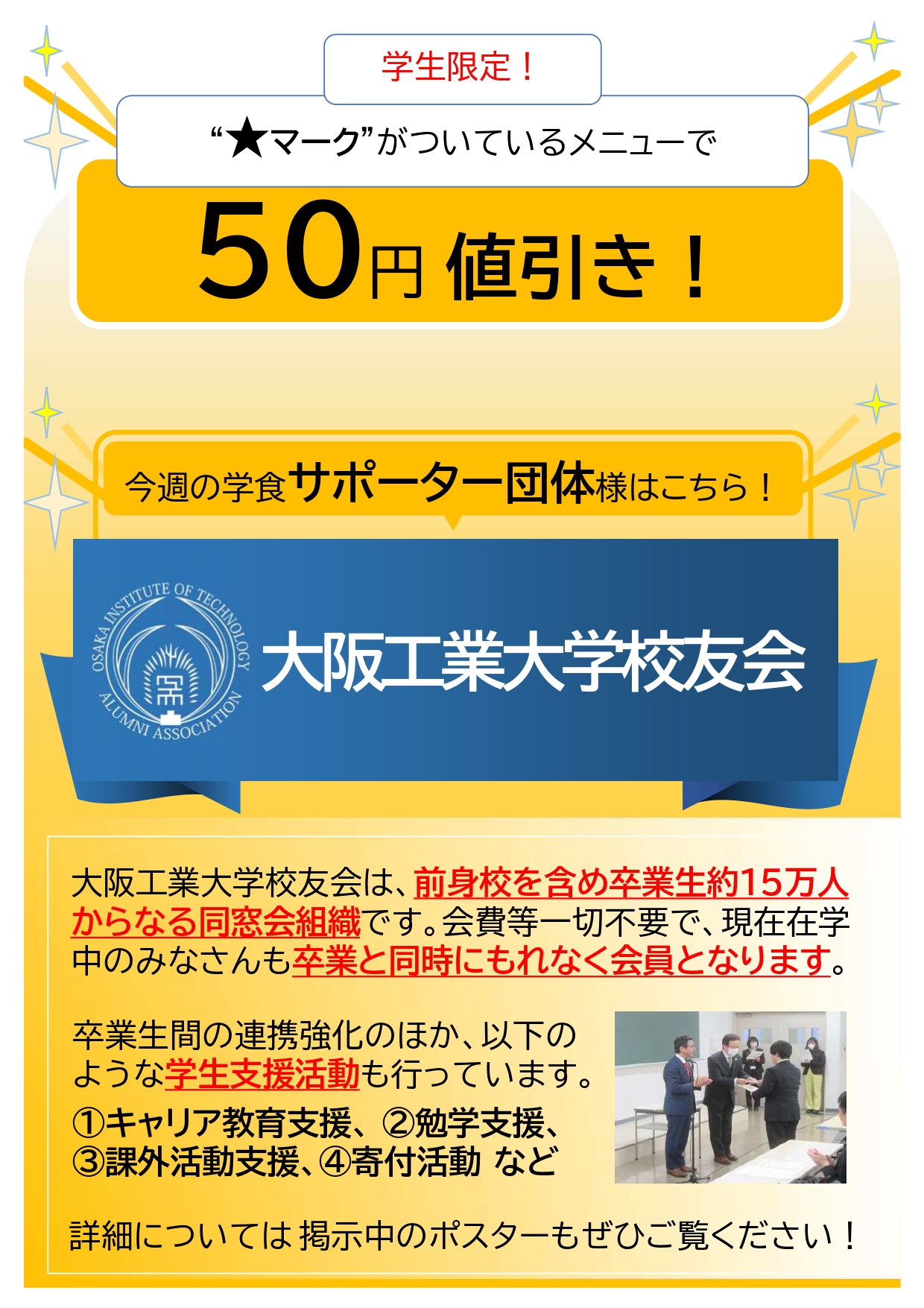 大阪工業大学の食堂で大阪工業大学校友会様から協賛頂き、学生限定でメニューの値引きを行う食支援を実施します。