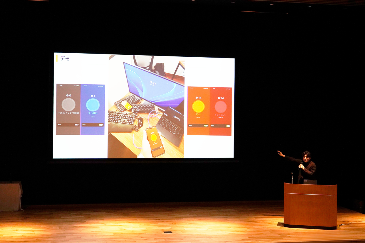 小林さんは、「行動インセンティブで創る新しい通勤体験」というテーマで、通勤・通学のストレス緩和策として、その理由の一つである入口付近の混雑解消のためのビジネスモデルを提案しました。具体的には、Bluetooth電波を発信する小型端末「ビーコン」を車両中央に設置し、独自に開発したスマホアプリと連動して位置を検知。車両中央部にいるユーザーにポイントを付与し、貯まったポイントは駅周辺施設での利用やJRの各種サービスなどと交換できる仕組みにより、乗客をドア付近から車両中央部に誘導します。