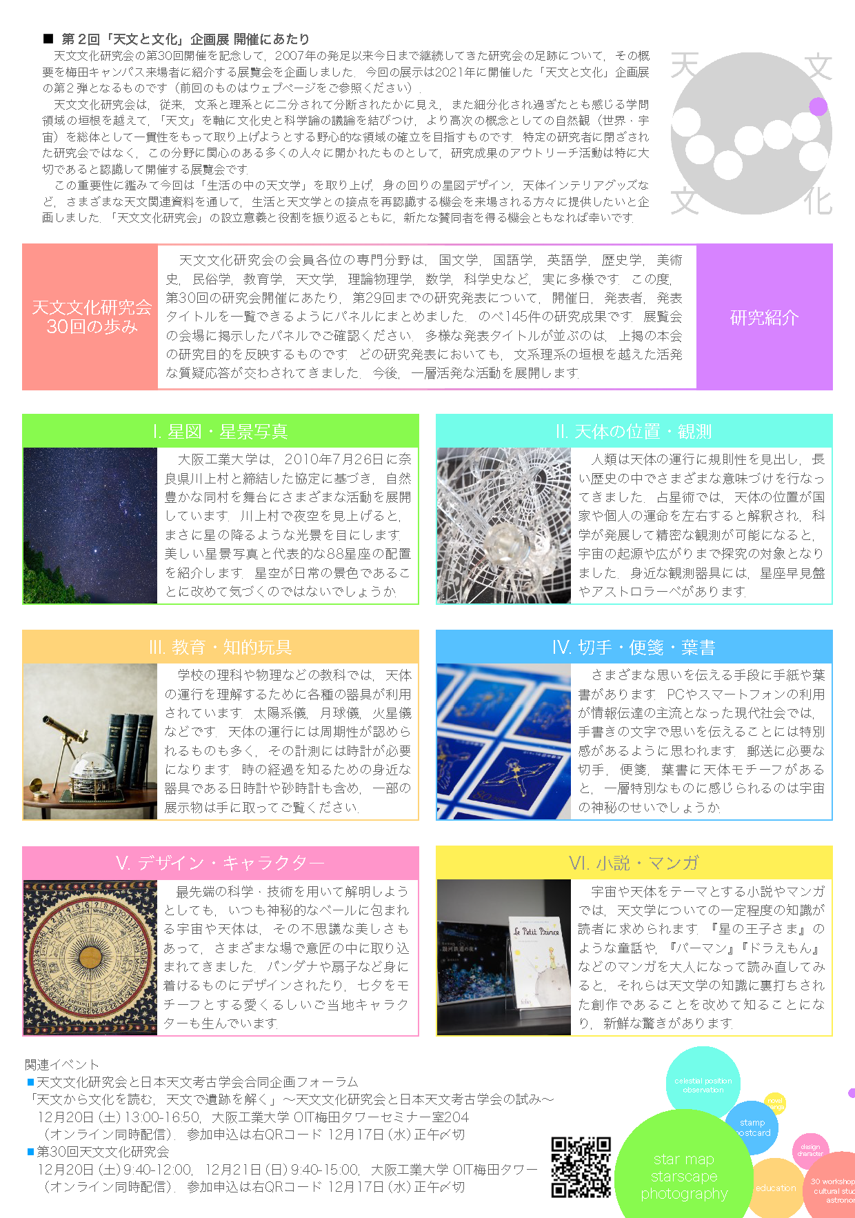 天文文化研究会の第30回開催を記念して,2007年の発足以来今日まで継続してきた研究会の足跡についてご紹介するとともに、今回は「生活の中の天文学」をテーマに、身の回りの星図デザイン、天体インテリアグッズなど、さまざまな天文関連資料についても展示します。