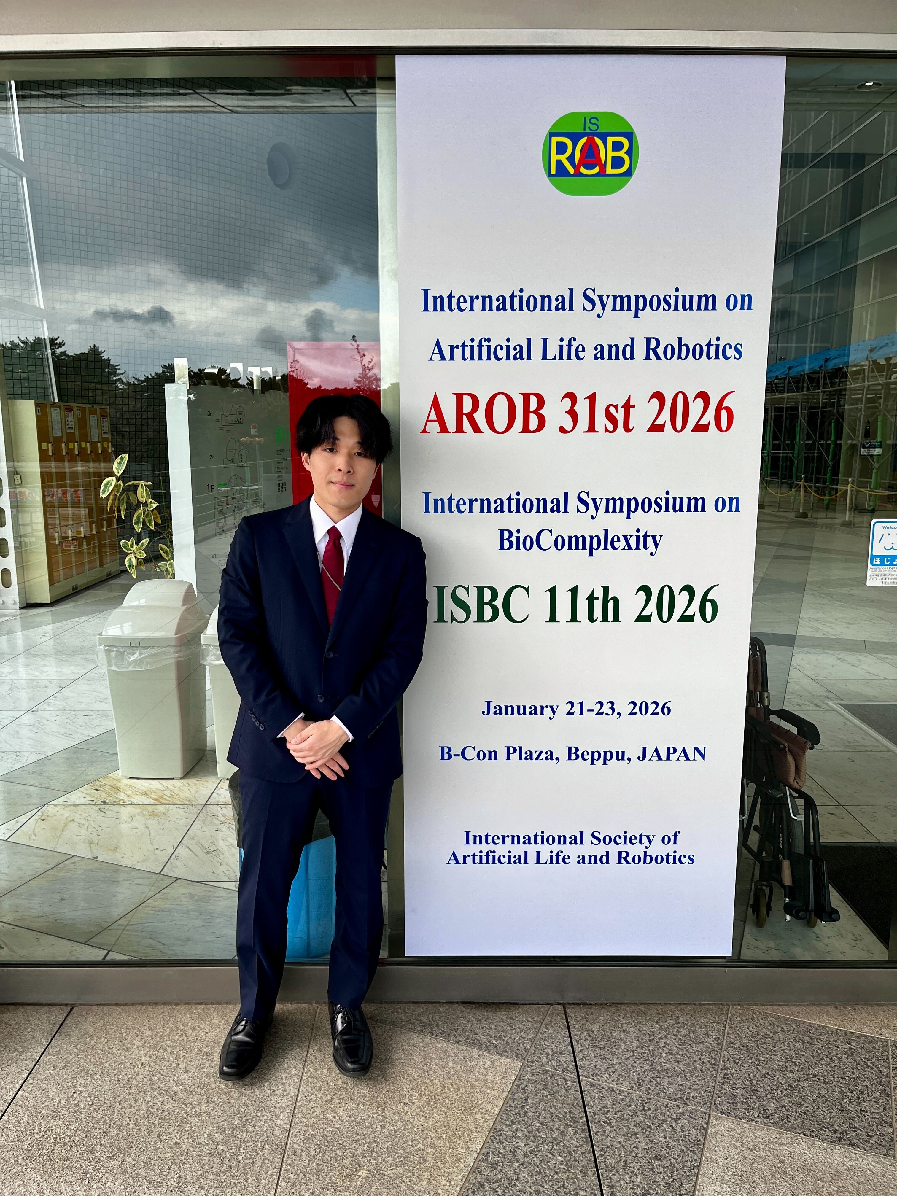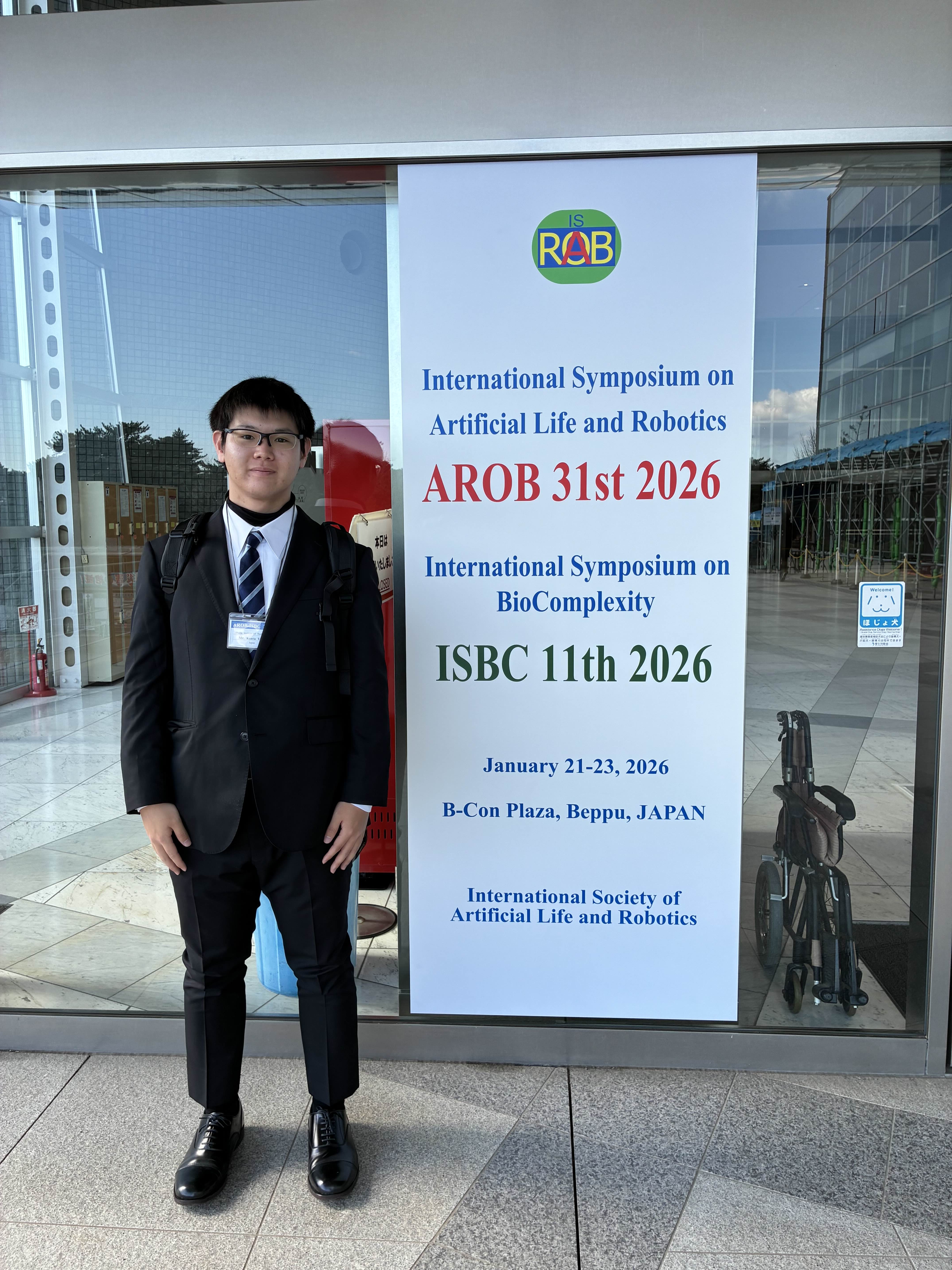 国際会議Thirty-first International Symposium on Artificial Life and Robotics 2026 (AROB 31st 2026, January 21-23)にて、知能応用システム研究室(指導教員:尾崎敦夫教授)に所属する大学院情報科学研究科・修士2年の芥川大樹さん(追手門学院高等学校卒業)と矢頭健太さん(大阪府立摂津高等学校卒業)が下記の研究成果を発表しました。