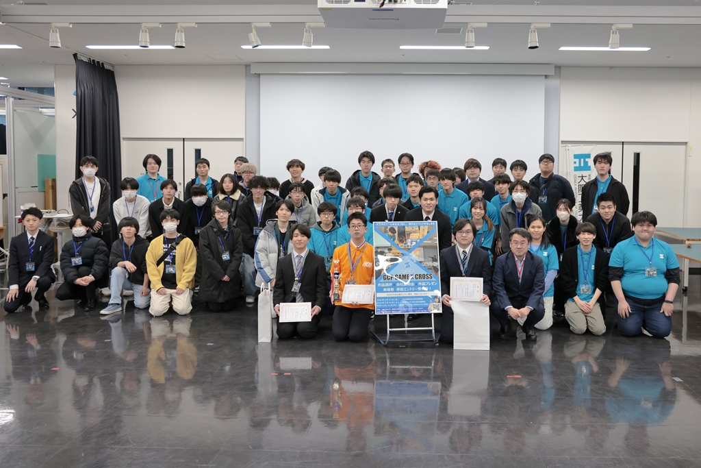出展者らは、ゲームの企画から、プログラム、グラフィックス、サウンドなどを手作りしたオリジナルゲームを紹介。出展チームのブースごとに来場者に解説・体験してもらい、完成度や独自性を評価する場を設けました。イベントの目玉となったのが、2日目に実施した「ゲームプレゼンテーション大会」。この大会は高校生にも公開され、学生生徒自身が作品の開発意図や工夫点を自らの言葉で発表します。技術力に加え、論理的な説明力や表現力を磨く絶好の機会となり、実践的なコミュニケーションスキル向上にもつながりました。審査の結果、見事、銀賞を受賞した矢野太陽さん(情報知能学科3年)は「制作に4カ月かかりました。初めて自分一人でゲーム開発を行ったこともあり、不安もありましたが、シンプルで直感的な2Dアクションゲームを制作することができ、アピールポイントをしっかり伝えることができました。銀賞を受賞でき、よい経験になりました」と活動を振り返りました。また、ゲーム関連企業による企業説明会も実施し、学生は業界の最新動向や求められる人材像を直接知ることができました。一方で企業側にとっても、発表や作品を通じて学生の技術力や発想力を評価する機会となり、こうした交流を通じて、学生のキャリア形成や企業の人材発掘が加速することが期待されています。ゲーム開発に興味のある高校生や一般来場者も参加できるこのイベントは、未来のクリエイターと産業界をつなぐ(クロス)ことを期待しています。