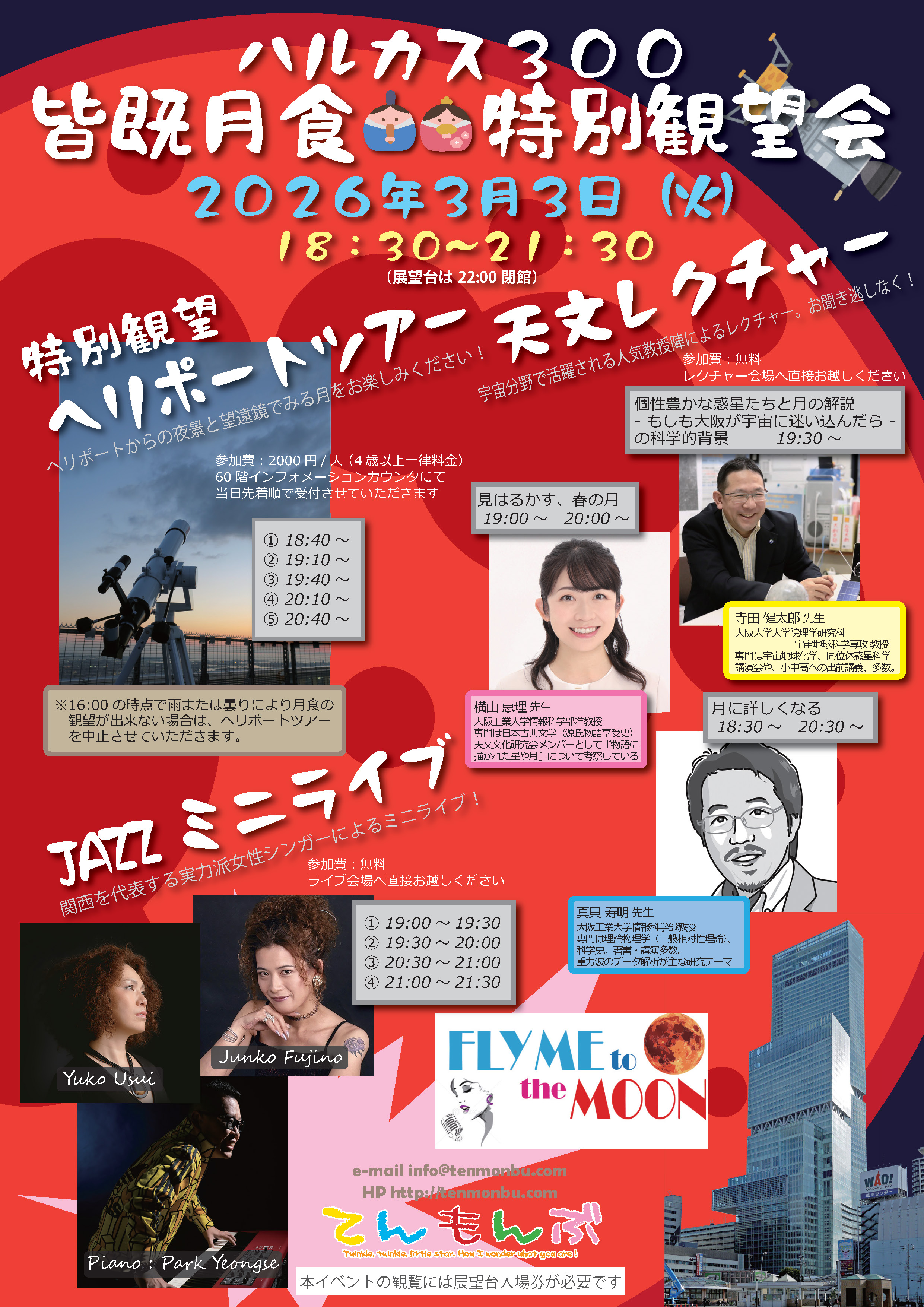3月3日、真貝寿明教授(情報システム学科、宇宙物理・数理科学研究室主宰)と横山恵理准教授(情報システム学科、日本文学研究室主宰)が、あべのハルカス展望台(ハルカス300)で開催される「皆既月食特別観望会」で「天文レクチャー」を行います。