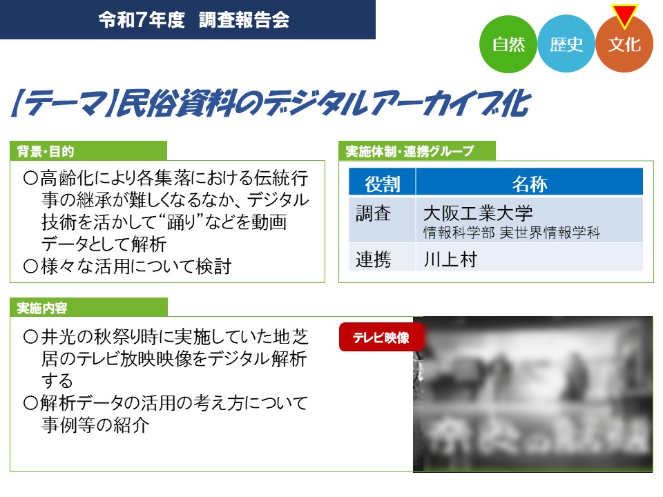 2026年1月24日、奈良県吉野郡川上村「森と水の源流館」令和7年度調査報告会にて、IoTシステム研究室・荒木英夫教授と、同研究室の大学院修士課程1年生・森松奎伍さんが、研究成果を発表しました(発表題目:地域文化遺産の保護を目指した3Dデータの構築手法と現状報告)。