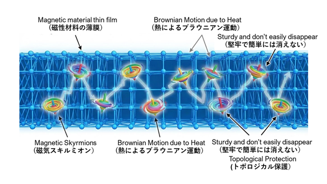 このイラストは、ブラウニアンコンピューティングの主役である「磁気スキルミオン」がどのようなものかを表しています。 スキルミオンは磁性体内で粒子のように振る舞う励起状態(※3)であり、外部からエネルギーを与えなくても、熱によって液体 中の微粒子のようにランダムに動き回る「ブラウン運動」をします。また、「トポロジカル保護(※4)」という性質により、熱 による撹乱の中でも消えずに安定して存在できる様子も表現しています。