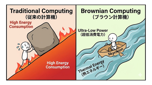このイラストは、ブラウニアンコンピュータが「究極の省エネ」とされる仕組みを対比で示しています。左側は従来の計算機で、 外部から強いエネルギーを与えて無理やり動かす必要があるため、消費電力が大きい様子です。右側はブラウン計算機で、ス キルミオンが熱によって勝手に動く自然なエネルギー(ブラウン運動)を計算プロセスに利用するため、外部からのエネルギ ーはわずかな制御だけで済み、極めて高いエネルギー効率が実現できる様子を、川の流れに乗る船に例えています。