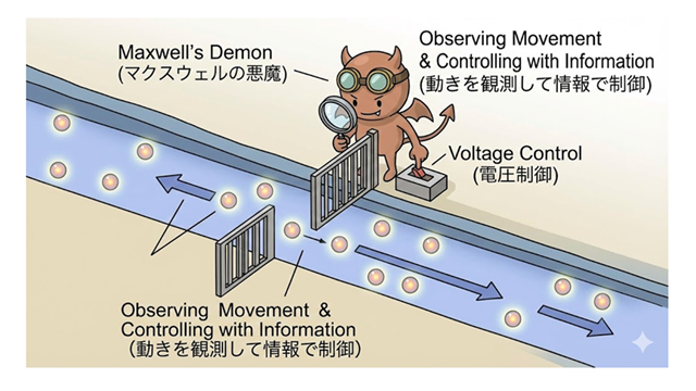 このイラストは、ブラウニアンコンピューティングにおける高度な制御技術を説明しています。研究では、スキルミオンがブラウン 運動で特定の方向へ移動しようとした時だけ電圧を加えてブロックするという、フィードバック制御が行われました。これは、 個々の粒子の動きを観察して選別する「マクスウェルの悪魔」の役割を、外部からの電圧制御によって実現し、川の流れを生み出したことに相当します。 この「情報を運動エネルギーに変換する」という、情報と物理が融合した最先端の概念を、門番のキャラクター(※5)で分かりやすく 表現しています。