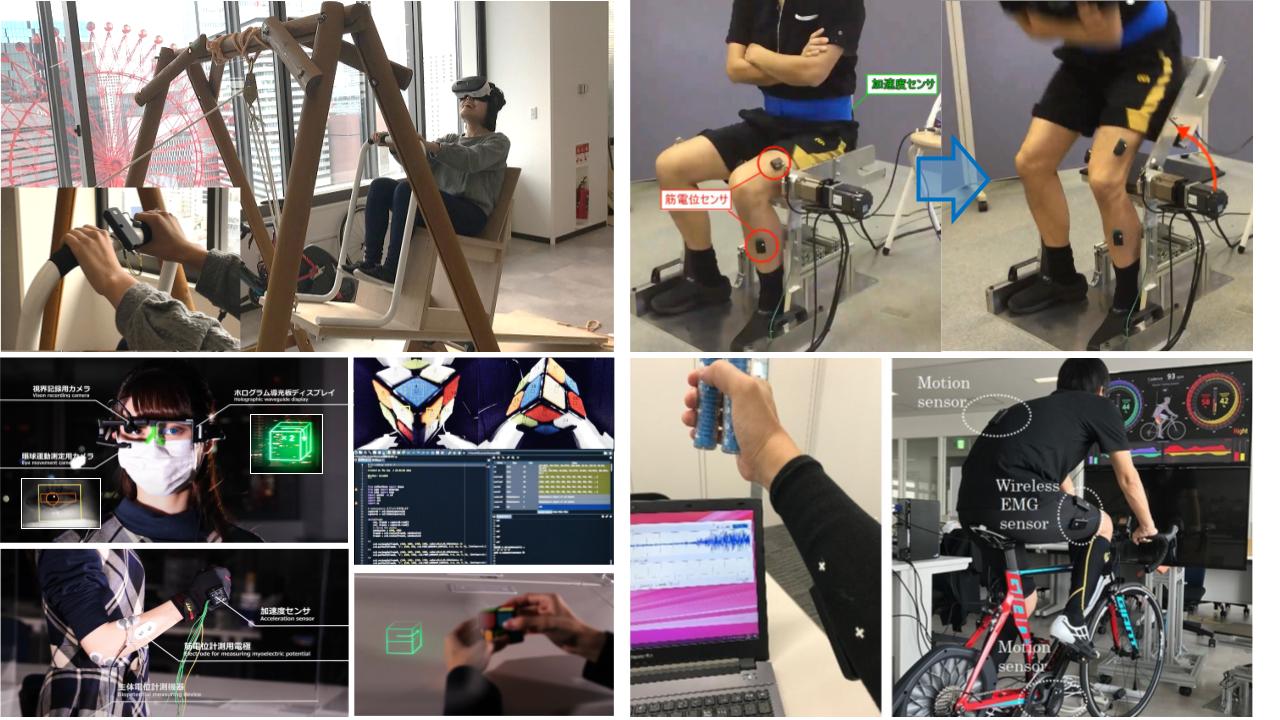 我々の研究室ではヒトのセンシングに基づく新しい価値創造を目指した研究を行っています。センシングの対象としては、心電や筋電に代表される生体信号や、モーションセンサや力センサによる人の動きや外部へ加えた力、さらには、音声や機器操作入力といった人間が人間や機器に対して行った出力のセンシングも含みます。 現在のテーマの例としては,筋の活動と体の動きの計測結果を使ったサイクリング技術の向上支援や、起立動作の予測・支援などについて研究・開発を行っています。